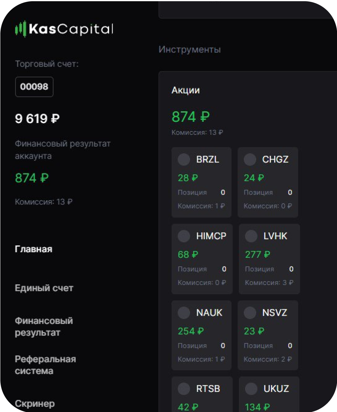 Наша экосистема и партнер KasCapital выделяет бесплатно каждому ученику депозит в 2500 Р на Московской бирже, который торгуя в плече х40 можно превратить в 100 000 Р. Этот депозит поможет вам протестировать наши стратегии без вложений и заработать свой первый капитал
